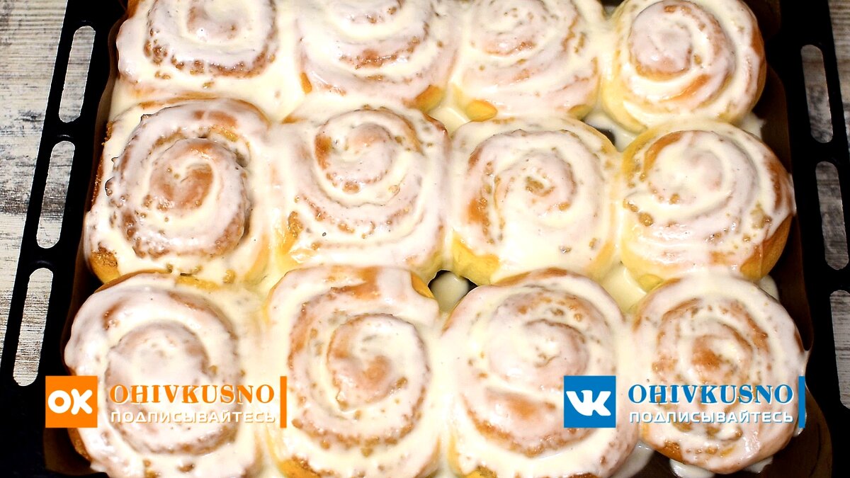 Булочки испеклись и сразу горячие я их смазываю сметанным кремом.