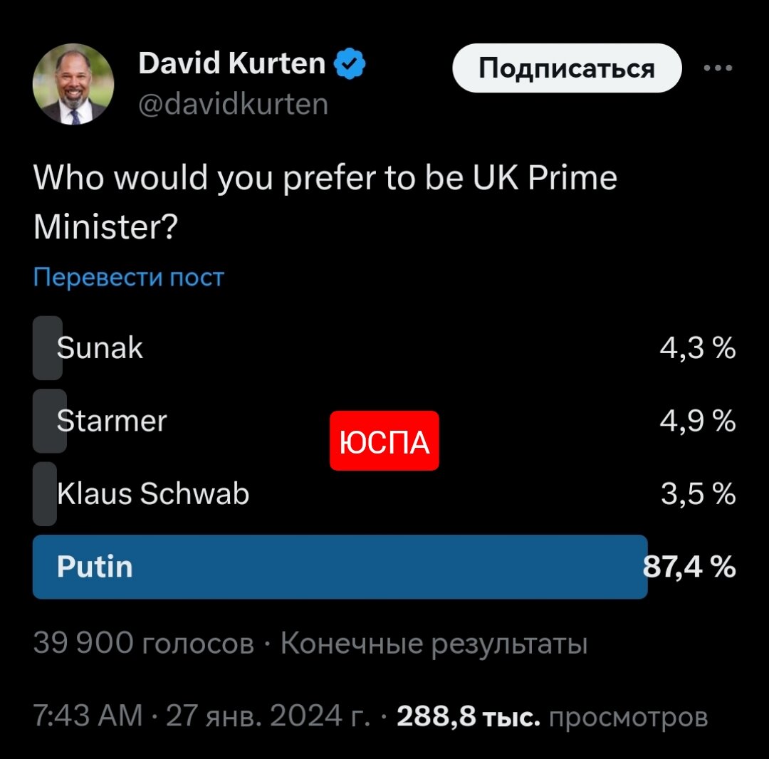 В этой неравной битве Владимир Путин обошёл действующего премьера Британии Сункака на 83%.
