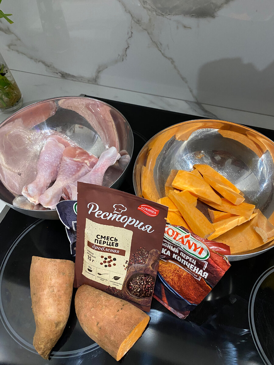 Буду благодарна каждому за лайк и подписку. Спасибо)) НАМ ПОНАДОБЯТСЯ : Продукты: Батат - 1,5 - 3 шт . ( смотря на сколько человек готовите) Голень ( курица) - 700 гр Перец, соль , паприка копченая, масло растительное - по вкусу. ПРИГОТОВЛЕНИЕ: Батат очищаем и нарезаем дольками. Затем добавляем специи и масло растительное ( немного). Укладываем в форму на пергамент. И сверху сбрызгиваем маслом ( у меня оливковое). Перемешиваем. Голень моем, промокнуть салфеткой и добавить все специи. Укладываем в форму и сбрызнуть маслом растительным . Все смешать. Разогреваем духовку до 200 градусов (смотрите по своей духовке) Отправляем запекать в разогретую духовку на мин 30. Затем добавляю градусы до 220-230 и еще 10-15 мин. Все готово и очень вкусно!! Приятного аппетита!!