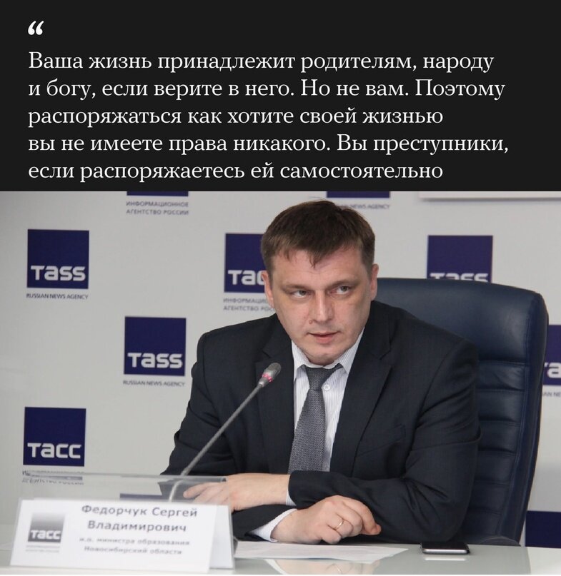 Руководитель департамента молодежной политики региона Сергей Федорчук в День студента пришел на встречу с учащимися Новосибирского государственного педагогического университета. Отвечая на вопросы собравшихся, он назвал преступниками тех, кто хотел бы распоряжаться жизнью самостоятельно.