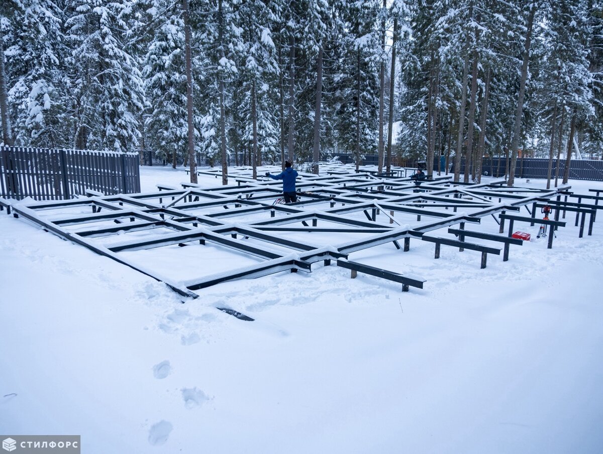 Большой проект, который мы выполнили за 35 дней. Фундаменты под дома сделали из сваи 108-ого диаметра, стенка 4 мм. Длины свай от 3,5 до 4 метров, так как на участке большой перепад. Сваи заполнили цементно-песчаной смесью. Обвязка из двутавра. Фундамент под террасы сделан из сваи 89 мм, стенка 3,5 мм, длины от 3,5 до 4 метров. Обвязка уголком. Фундаменты под дома и террасы проверяем на допуск по перепаду лазерным нивелиром.
