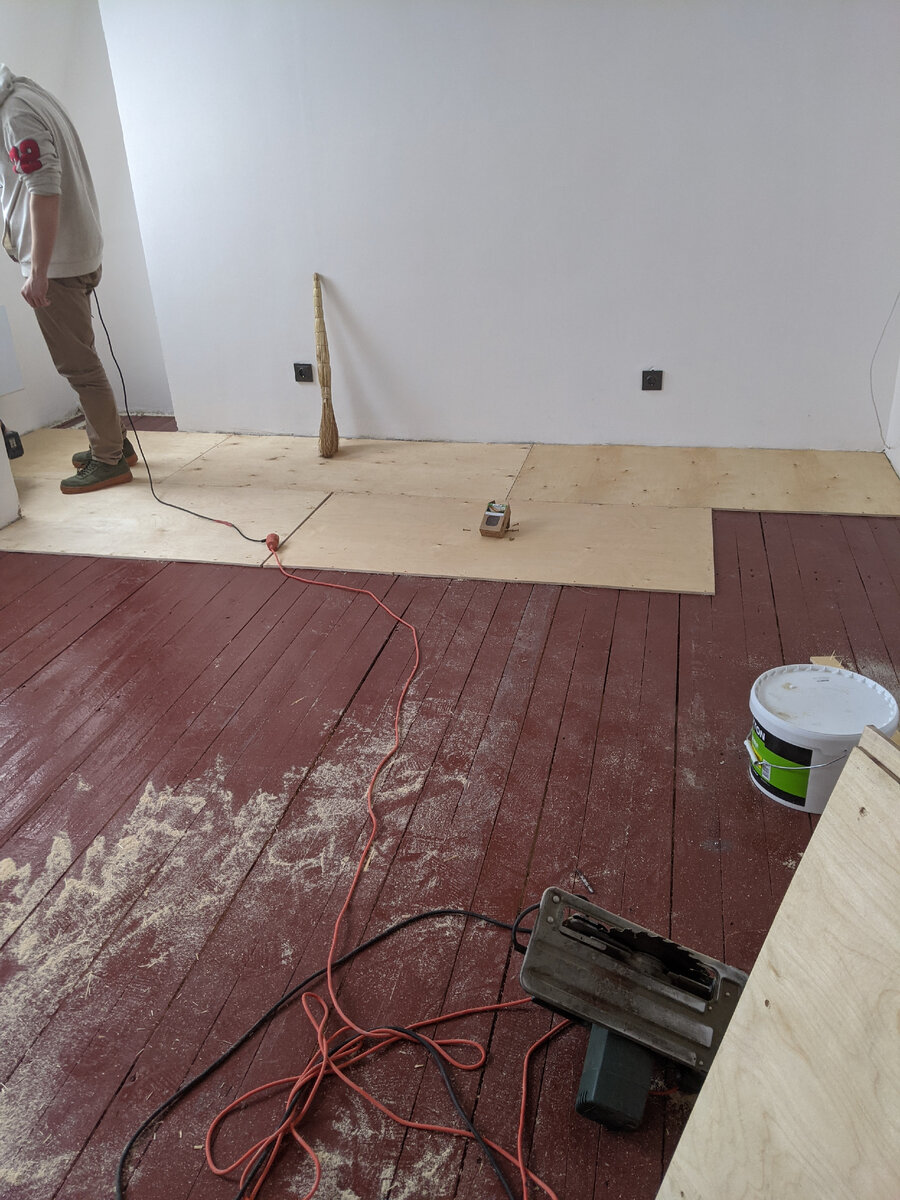 В общем, в первый рабочий день ребята успели нарезать, выложить и закрепить фанеру в спальне, на кухне и в прихожей.