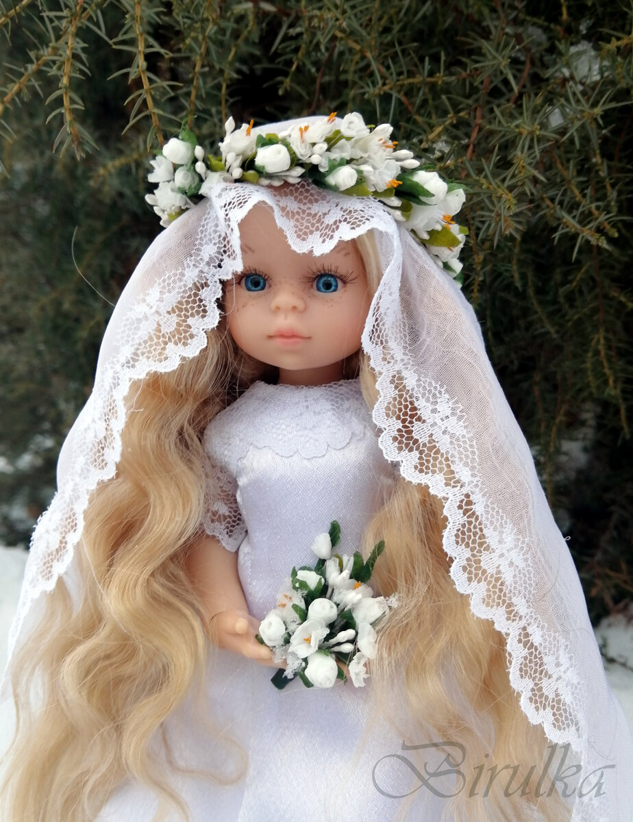 Здравствуйте! Меня зовут Юлия. Здесь я рассказываю про своих кукол, рукоделие и рукоделие для кукол. В группе ВК "Немножко о куклах, ООАК и ручной работе" https://vk.com/ooakmsk проходит коллаб "Свадьба", в рамках которого нужно создать наряд невесты. Моя модель-невеста - мини паолочка уже обзавелась свадебным венком и букетом. Бутоньерку для жениха я тоже сделала, но до самого жениха руки так и не дошли. К сожалению в линейке мини подружек у PAOLA REINA нет подходящего мне парня ( я хочу мальчика с молдом как у моей невесты, а таких пока фабрика не делает). Хотела переделать одну из моих кукол-девочек (фу, звучит не очень)), но так и не собралась. А потому только невеста Немного поморозила свою невесту, но даже настоящие невесты готовы на многое ради красивых фото)) А теперь "студийные" фото И все же невесту "делает" фата)) В нашем случае так точно. Без фаты это просто милая девушка с букетом в белом платье. А с фатой - невеста! И собственно - фата. Я несколько помучилась с ней, по
