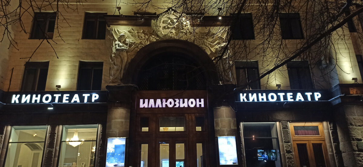 Пока она была на спектакле мы гуляли по району. Дошли до кинотеатра Иллюзион.