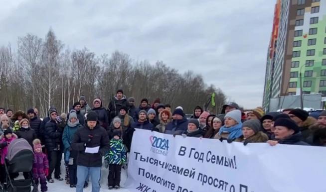 Многие из обращающихся пришли к стройплощадке с колясками и детьми, подчеркивая тем самым невыносимость ситуации для семей, вынужденных платить за аренду и ипотеку в течение нескольких лет, не получив при этом свои доли в недвижимости.