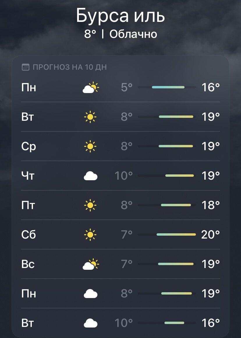 К слову, ближайшие 10 дней какие-то сумасшедшие в плане погоды. Только посмотрите на погоду в Бурсе и Стамбуле. Чувствуется уже дыхание весны...