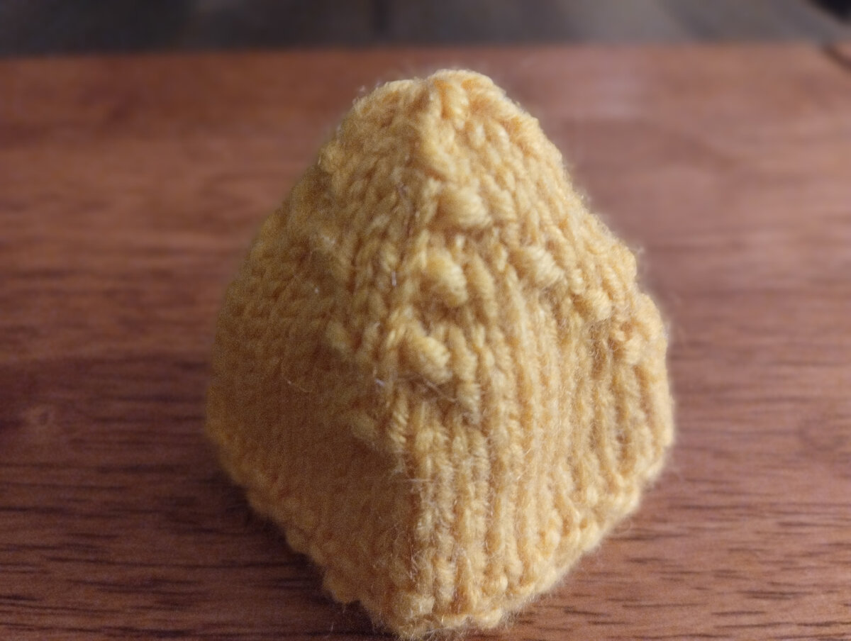 На этом этапе убавки делаем в каждом круге. Убавляем до тех пор, пока на спицах ни останется всего 8 петель. Нить с помощью иглы дважды протягиваем через эти петли, затягиваем и закрепляем нить на изнаночной стороне мыска.