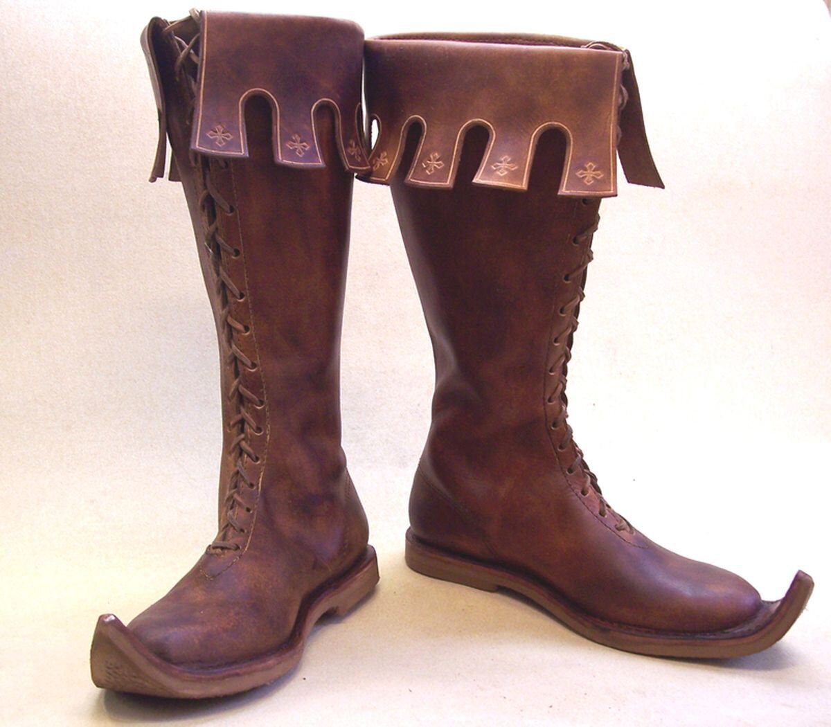 В пятнадцатом веке мужчины носили длинные сапоги, доходившие до бедер, обычно из коричневой кожи. Этот стиль был распространен среди всех сословий. Несмотря на такую широкую популярность, это был категорически неподходящий стиль для женщин; фактически, это было одним из главных уголовных обвинений против Жанны д'Арк в 1431 году. Это было более характерно для женщин в четырнадцатом веке принято было носить ботильоны на шнуровке, которые часто подбивались мехом.