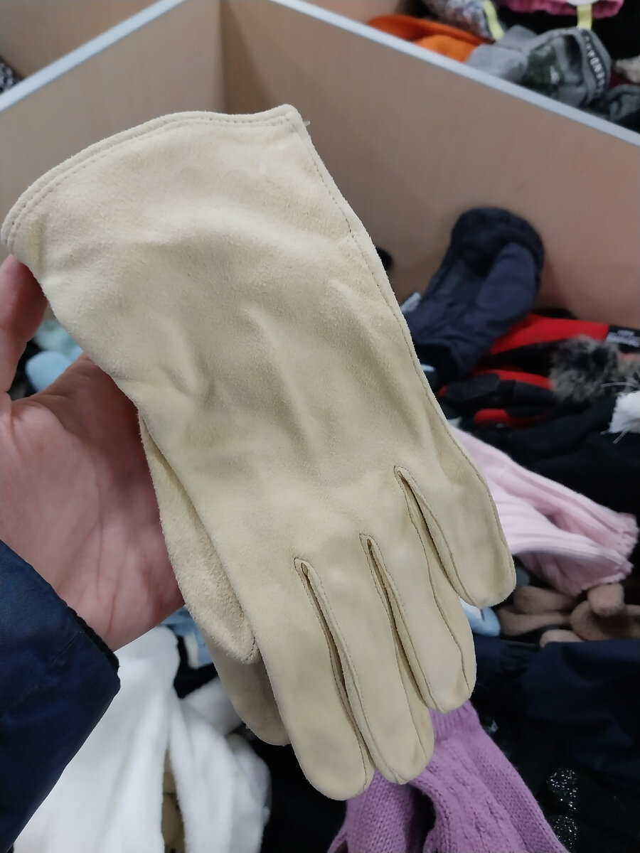 Вчера я не успела сходить в ВоВу на привоз, поэтому пошла сегодня - в воскресенье. Думаю, особо ничего не потеряла, так как товара было ну очень много. Напомню, что я смотрю не все товары, так как обычно на это нужна масса времени. Трачу на поход в 1 сэконд около часа. Успеваю посмотреть аксессуары (ремни, если есть, перчатки/рукавицы, сумки), обувь (обязательно), детское (не всегда), нижнее белье (там же пижамы, корректирующие вещи - боди, майки, термобелье), верхнюю одежду и стойку "все по 300". Иногда ещё заглядываю в спортивные товары и домашний обиход. Одежду повседневную не очень люблю смотреть, так как навешано очень плотно, много, 90% - это неинтересное мне (масс маркет или устаревшие фасоны). Пройдёмся вместе по секонду? Первое, что видим у входа, аксессуары. Обычно у нас их немного. В этот раз заинтересовали перчатки. Какие-то они необычные, ткань похожа на замшу тактильно, но это именно ткань. Стоили 200 рублей. Похоже, что новые. Уже дома нашла эту марку на сайте ЦУМА. В