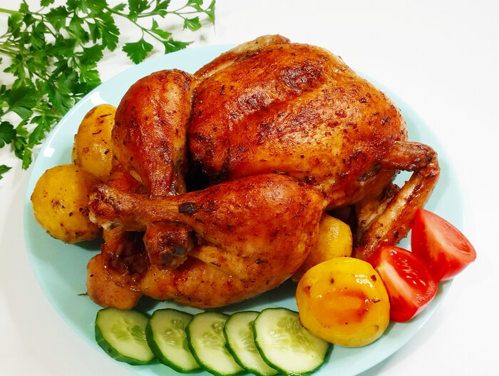 Пожалуй, это самый мой любимый рецепт приготовления курицы в духовке. Простой, без заморочек и редких ингредиентов, с вкуснейшим результатом. Список необходимых ингредиентов: курица 1 шт (1, 700 - 2 кг) чеснок 3 зубчика розмарин 1 ч. л перец черный свежемолотый 0, 5 ч. л паприка сладкая 1 ч. л соль 1 ст. л масло растительное 50 мл. Первым делом, срезать с курицы торчащие куски кожи, кончики крыльев (по желанию), и жировую железу с гузки. Подготовленную тушку промыть и обсушить любым удобным способом. В любой подходящей емкости соединить натертый чеснок со всеми приправами и растительным маслом. 4. Полученной ароматной пастой хорошо натереть курицу внутри и снаружи. Засунуть в пакет и оставить мариноваться часа на 4 минимум. А лучше на ночь. 5. Выложить курицу на противень (я предпочитаю использовать одноразовые, из Фикс Прайс, с мытьем потом не надо заморачиваться). Если осталось свободное место, можно заодно запечь несколько картофелин на гарнир. 6. Запекать в духовке разогретой до 18