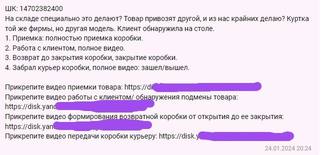 Клиенты постоянно спрашивают, зачем проверять товар под камерами. Да потому что ВБ СОЗДАЕТ ПРОБЛЕМЫ ВСЕМ! Если бы компания работала честно и заказы приходили правильно - всем было бы спокойно! При оспаривании штрафов требуют видео движения товара. Из паблика ВК Во время приёмки товара мы пакеты не вскрываем и определить сложно, тот товар привезли на ПВЗ или подмену, неверное вложение и тд. Пришла клиент, в заказе две одинаковые куртки разного размера, по 46800!!! Вскрывает на столе и сообщает, что куртка не та, я в это время за всем процессом слежу, тк я вижу, что передала клиенту в руки 93600 рублей!!! Куртка другой модели, но той же фирмы. Делаю отметку по несоответствию, отказ!