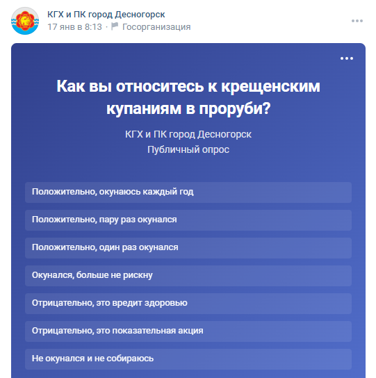 К количеству контента вопросов нет. Качество же оставляет желать лучшего. В пересчете на одну публикацию 103 млн превращаются в 231 просмотр - довольно скромный показатель. Кроме того, вместо одного канала с актуальной и полезной информацией создаются несколько с гораздо менее актуальной. Например, в Десногорске официальные страницы появились не только у комитетов городской администрации, но даже у отделов. В результате юридический отдел информирует о закрытии городской елки, а комитет по городскому хозяйству проводит опрос об отношении к купаниям в проруби.