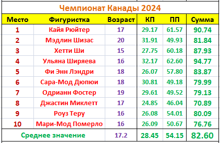 Примечания к табличкам ниже. КП, ПП - оценка за технику фигуристки соответственно в короткой и произвольной программах. Сумма - сумма баллов за технику фигуристки в короткой + произвольной программах. Среднее значение - средний возраст, а также средние баллы за технику в КП, в ПП и по сумме 10 лучших фигуристок чемпионата.