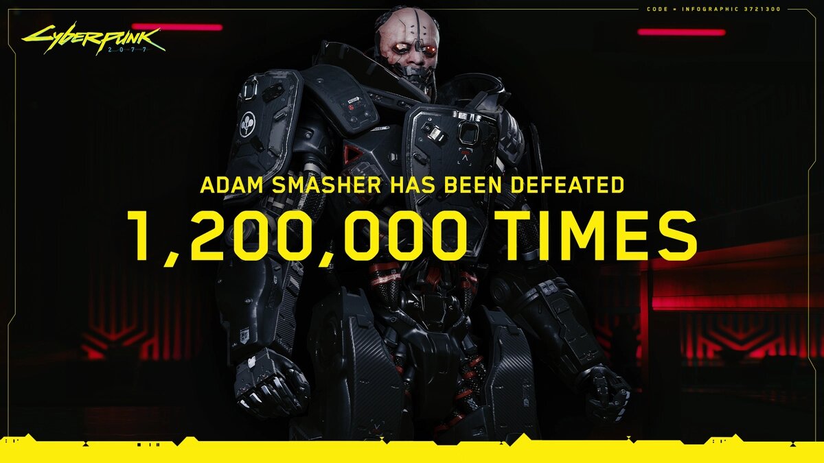 Студия CD Projekt RED непонятно зачем поделилась со всеми статистикой количества смертей Адама Смэшера в игре Cyberpunk 2077. Легендарный наемник погиб от рук Ви более 1,2 миллиона раз. “Адам Смэшер единолично несет ответственность за разрушение мечтаний многих начинающих киберпанков. К счастью, игроки отомстили любимому киберпсихопату "Арасаки", победив его более 1,2 миллиона раз. И мы даже не будем упоминать творческие способы, которые Ви выбрал, чтобы победить его”. К сожалению, разработчики так и не смогли сделать из Смэшера того персонажа, которым он является во вселенной настольных игр Cyberpunk, созданой Майком Пондсмитом. Даже на самом высоком уровне сложности игры, финальный бой с Адамом — это лишь унылая рутина, и наемник вообще ничего не может противопоставить главному герою, даже если спидранить игру. И, да, называть Смэшера киберпсихом — верх невежества. Он максимально собран и всегда контролирует свои эмоции.