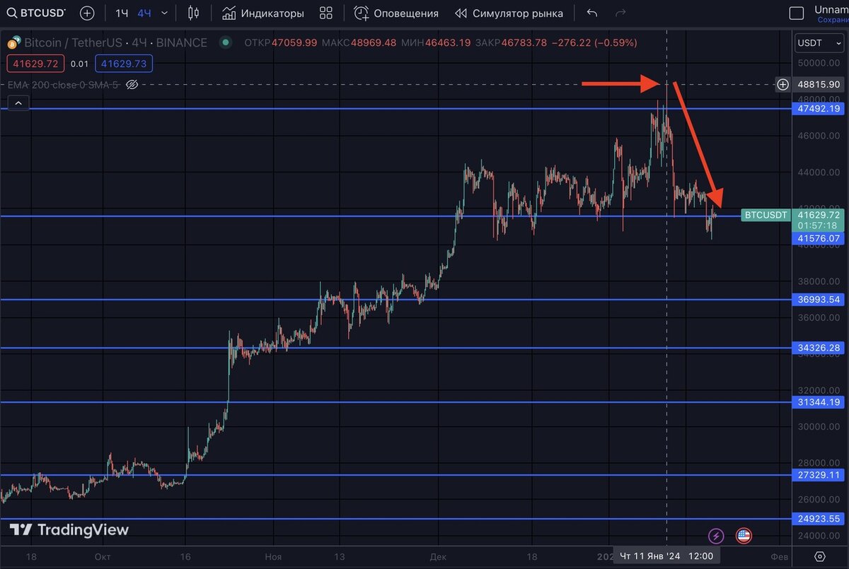 , ΡΠ°ΠΊ ΠΈ Π² ΠΆΠΈΠ·Π½ΠΈ. Π Π·Π°Π±ΡΠ²Π°Ρ ΠΎ Π½Π΅ΠΌ - ΠΌΠΎΠΆΠ½ΠΎ ΠΏΠΎΡΠ΅ΡΡΡΡ Π½Π΅ΠΌΠ°Π»ΠΎ Π΄Π΅Π½Π΅Π³. Π Π°Π·Π±ΠΈΡΠ°ΡΡ Π±ΡΠ΄Π΅ΠΌ Π½Π° Π½Π΅Π΄Π°Π²Π½Π΅ΠΌ Π³ΡΠΎΠΌΠΊΠΎΠΌ ΠΏΡΠΈΠΌΠ΅ΡΠ΅! 11 ΡΠ½Π²Π°ΡΡ ΠΏΡΠΎΠΈΠ·ΠΎΡΠ»ΠΎ Π·Π½Π°ΠΊΠΎΠ²ΠΎΠ΅ Π΄Π»Ρ ΠΊΡΠΈΠΏΡΠΎ-ΠΈΠ½Π΄ΡΡΡΡΠΈΠΈ ΡΠΎΠ±ΡΡΠΈΠ΅ - Π·Π°ΠΏΡΡΡΠΈΠ»ΠΈ ΡΠΏΠΎΡΠΎΠ²ΡΠΉ ETF Π² Π‘Π¨Π Π½Π° Bitcoin. ΠΡΠ»ΠΈ Π½Π΅ ΠΏΠΎΠ½ΠΈΠΌΠ°Π΅ΡΠ΅, ΡΡΠΎ ΡΡΠΎ - Π½Π΅ Π±Π΅Π΄Π°, Ρ ΠΏΠΎΡΡΠ½Ρ Π΄Π°Π»Π΅Π΅. Π ΠΌΡ ΡΡΠ°Π·Ρ ΠΏΠΎΡΠΌΠΎΡΡΠΈΠΌ Π½Π° ΠΏΠΎΠ½ΡΡΠ½ΡΠΉ Π³ΡΠ°ΡΠΈΠΊ ΡΠ΅Π½Ρ! ΠΠΎΡ ΡΠΊΡΠΈΠ½ Π³ΡΠ°ΡΠΈΠΊΠ°: ΠΠ°ΠΆΠ½ΠΎΠ΅ ΠΎΡΠΌΠ΅ΡΠΈΠ» ΡΡΡΠ΅Π»ΠΊΠ°ΠΌΠΈ. ΠΠΌΠ΅Π½Π½ΠΎ 11 ΡΠ½Π²Π°ΡΡ ΡΠ΅Π½Π° Π΄ΠΎΡΡΠΈΠ³Π»Π° Π»ΠΎΠΊΠ°Π»ΡΠ½ΠΎΠ³ΠΎ ΠΏΠΈΠΊΠ° ΠΈ ΡΡΡΡΠ΅ΠΌΠΈΠ»Π°ΡΡ Π²Π½ΠΈΠ·. Π‘Π°ΠΌΠΎΠ΅ Π³ΡΠΎΠΌΠΊΠΎΠ΅ ΠΈ ΠΎΠΆΠΈΠ΄Π°Π΅ΠΌΠΎΠ΅ ΡΠΎΠ±ΡΡΠΈΠ΅ - ΡΡΠ°Π»ΠΎ ΠΏΡΠΈΡΠΈΠ½ΠΎΠΉ ΡΠ°Π·Π²ΠΎΡΠΎΡΠ° ΡΠ΅Π½Ρ. Π ΠΊΠΎΠ³Π΄Π° ΡΠ΅Π½Π° Π½Π°ΡΠ°Π»Π° Π°ΠΊΡΠΈΠ²Π½ΡΡ ΡΠ°Π·Ρ ΡΠΎΡΡΠ°? ΠΠΎΡ ΡΠΊΡΠΈΠ½ Ρ ΠΎΡΠ²Π΅ΡΠΎΠΌ. 16 ΠΎΠΊΡΡΠ±ΡΡ ΠΏΡΠΎΠΈΠ·ΠΎΡΠ΅Π» ΡΠΈΠ»ΡΠ½ΡΠΉ ΠΏΡΠΎΡΡΡΠ΅Π» Π²Π²Π΅ΡΡ