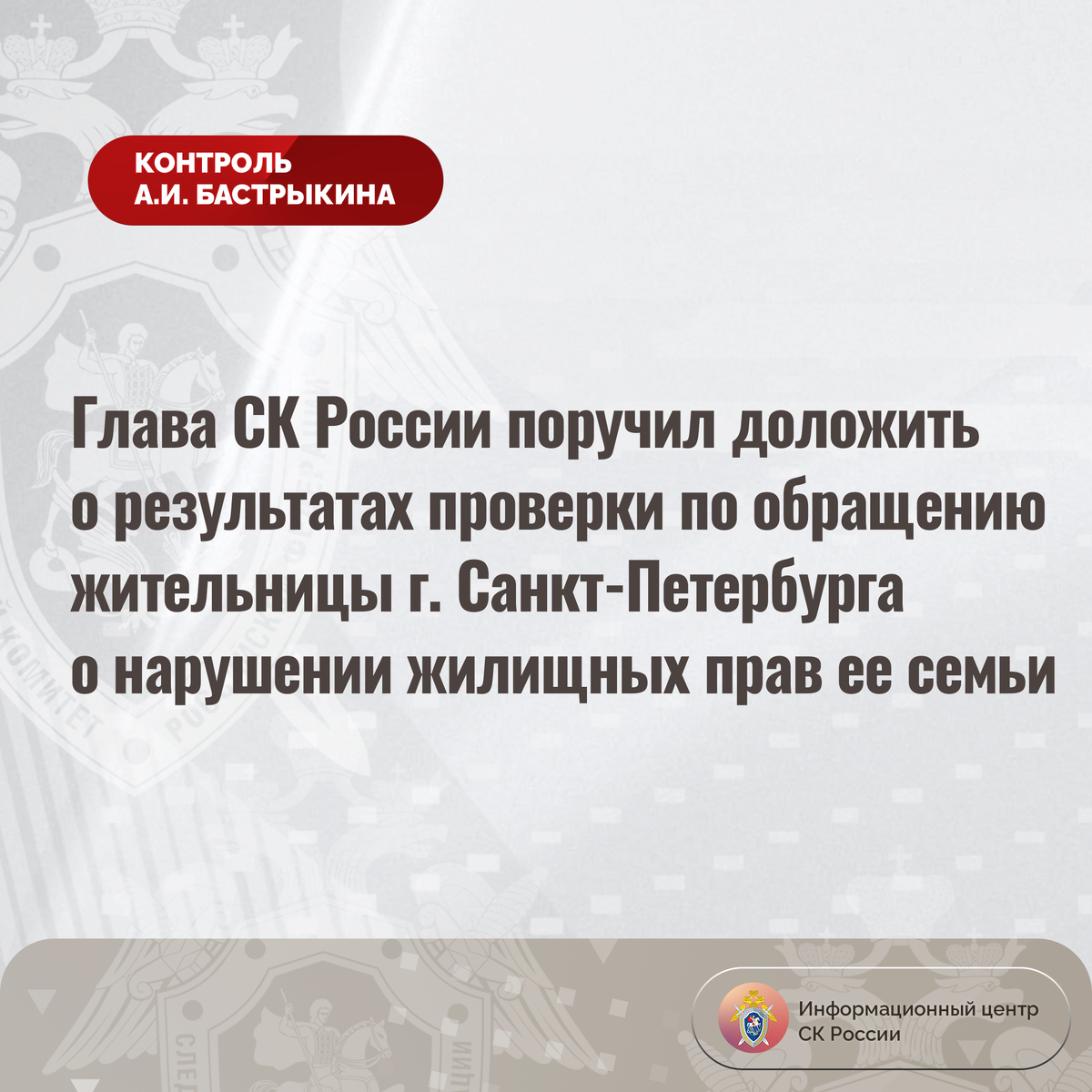 Глава СК России поручил доложить о результатах проверки по обращению жительницы г. Санкт-Петербурга о нарушении жилищных прав ее семьи