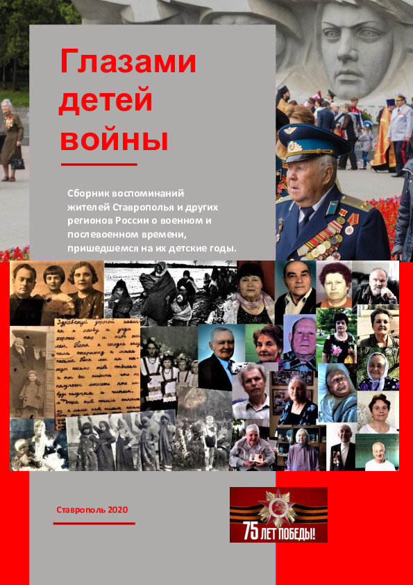 Глазами детей войны: сборник воспоминаний жителей Ставрополья о военном и послевоенном времени, пришедшемся на их детские годы Сборник включает мемориальные материалы и статьи, собранные на территории Ставропольского края членами объединённого добровольческого движения в период деятельности по профилактике распространения коронавирусной инфекции «Covid-19», обработанные добровольцами из аудио-, видеоинтервью, рукописей, сделанных самими «детьми войны» либо их родственниками. «Глазами детей войны» – это уникальные воспоминания пожилых людей, которым сегодня за 80 лет, на чьи плечи легли не только ужасы самой Второй мировой войны, но и тяготы послевоенного времени. Этот сборник – живая история уходящего «стального поколения», вложившего в своё Отечество все силы, поднявшего его из руин и пребывающего пока в незаслуженном забвении. Именно это стало толчком для понимания участниками Движения Добровольцев Ставрополья своей ответственности перед этими людьми за передачу памяти следующим поко
