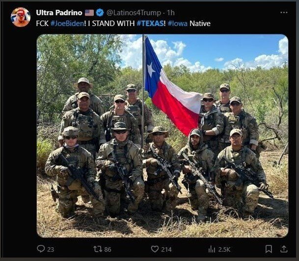 Противостояние Техаса против правительства Байдена, который и поощряет все эти проблемы связанные с миграцией, получило поддержку в 25 штатах... Новая конфедерация из поддержавших Техас штатов стала объединятся в военном противостоянии и отправила Техасу в поддержку тяжелую военную технику: 400 Хаммеров, 70 БМП М2 Бредли, 40 самоходных гаубиц М109. Про оружие которое находится на руках у населения Техаса нет смысла долго говорить. Согласно статистике на одни руки приходится в среднем три ствола .