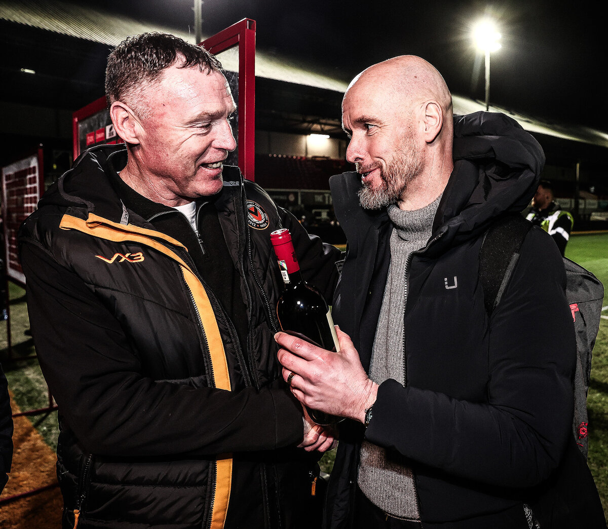 «Манчестер Юнайтед» обыграл клуб из 4-й лиги в Кубке Англии – 4:2. После матча главный тренер манкунианцев Эрик тен Хаг вручил Грэму Кофлану бутылку вина Antinori Tignanello. Нидерландец сообщил, что сделать выбор ему помог Алекс Фергюсон, ранее возглавлявший «МЮ». Кофлан, получив подарок, пошутил: «Великолепно. Знаете, я не пью вино, я пью Budweiser». Тен Хаг ответил: «Серьезно, Budweiser? Американское пиво? Но это действительно хорошее вино, его выбрал сэр Алекс, так что, может, оно понравится вашей жене. Может, и сами попробуете? Думаю, вам понравится. Хорошо поработали сегодня». Фото: twitter.com/ManUtd