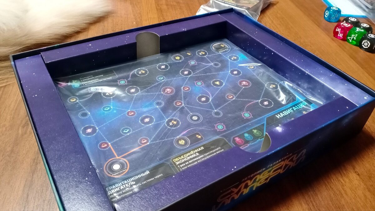 Про коробас, кстати: гляньте, какая интересная обстановка внутри. Картонной формой заняли свободное пространство + в этой же форме есть специальные выемки, дабы пальцами удобно было вытаскивать планшеты игроков, коих тут... много — в «Летопись» можно сыграть аж ввосьмером + имеется бот, если вдруг вы играете в соло (или же вдвоём). Теперь к сути: в рамках «Летописи» игрокам предлагается возглавить одну из 17 фракций (не могу подсказать, были ли они все в оригинальной игре, однако лёвушек aka хаканов узнал), дабы привести её к славе и величию. Победитель, соответственно, станет императором аж целой галактики. Приводить будем с помощью четырёх планшетов (да-да, каждому игроку предстоит оперировать сразу с четырьмя), огроменных кубиков (был у меня один шестигранник, размером с кулак. Эти же размером с ледяные камни для напитков — тоже, согласитесь, довольно большие) и карточек событий, поделённых на пять эпох. В каждой эпохе есть как стоковые события, так и дипломатические (необходимо голосовать либо «за», либо «против»), и, конечно же, военные — за время партии придётся померяться силами с соседями по столу (но лишь номинально, типа как в «7 Чудес»). Как многие из вас догадались, события, кубики и планшеты связаны друг с другом механиками «Flip-and-Write» и «Roll-and-Write»: что видим, глядя на карту события / бросок кубов, то и вносим на один из планшетов, согласно выбранной тактике.