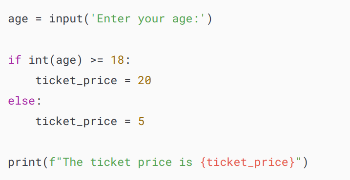В этом примере следующий оператор if...else присваивает ticket_price значение 20, если значение age больше или равно 18. В противном случае он присваивает ticket_price значение 5: