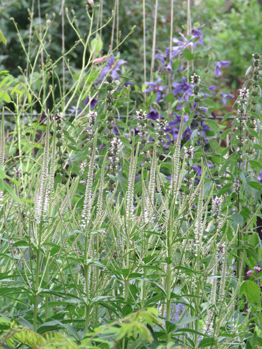 На днях в голову пришла страшная 🤣 мысль: если мне не заниматься "игрой в пятнашки" с растениями в саду, а просто взять их и высадить в соответствии придуманной схемы на пустом участке, то я точно создам пол нового сада. Сразу. 😁 Но пока игрища с пространством продолжаются. И в этих играх (хорошо, хоть не на выживание) самые просто заполняемые места это - самые дальние. С одной стороны я легко отринула выпендрежные у меня в агротехнике дельфиниумы, а с другой прикупила некоторое количество высоких вероникаструмов 🤣 и теперь плавно распределяю "некоторое это количество"😁, чтобы рядом не толпились.. А были выше всех на голову... С чем сорт "Фасцинейшен" хорошо справляется. Сорт старый, проверенный и с изюминкой. Но не каждому тот "изюм" достается. Честно, зависит от экземпляра... Я вот выпросила вторую деленку этого сорта, который предрасположен к фасциации. Мой то товарищ ровненький, без всяких этих монстрозных вкраплений в общий облик. Цвет, кстати, зависит от освещения. Мой немн