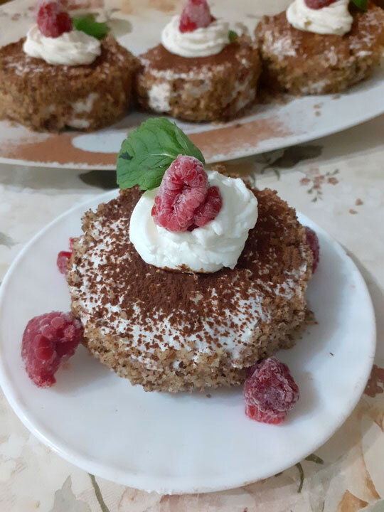 Для бисквита: ✔ Яйца – 4 шт.; ✔ Творог – 100 г; ✔ Какао -50 г (2 ст. л.); ✔ Яблоко – 50 г; ✔ Сахарозаменитель – по вкусу; ✔ Соль – щепотка; ✔ Ванилин – 1 пакетик; ✔ Разрыхлитель – 1 пакетик. Для крема: ✔ Творог – 200 г; ✔ Сливки (или сметана, йогурт)– 50 г. Для украшения: ✔ Грецкие орехи молотые – 50 г, ✔ Какао – 20 г; ✔ Ягоды любые – 50 г. Отделить яичные белки от желтков. Белки взбить в крепкую пену с щепоткой соли и ванилином. В желтки добавить творог, какао, разрыхлитель. Я еще добавила натёртое яблоко (это вместо подсластителя, я так часто делаю). Желтковую массу тоже хорошо взбить, можно погружным блендером. В желтковую массу аккуратно ввести белки, выложить на противень, разравнять. Корж выпекать 20 минут при 180 градусах. Корж остудить. Стаканом вырезать заготовки для пироженок. Крем: 200 г творога взбить с 2 ст. л. сливок (йогурта, сметаны). «Прослоить» заготовки кремом, соединить. Бока и верх я обсыпала молотыми грецкими орехами и какао. КБЖУ на 100 г – 148/13,3/10,7/5,5. +3