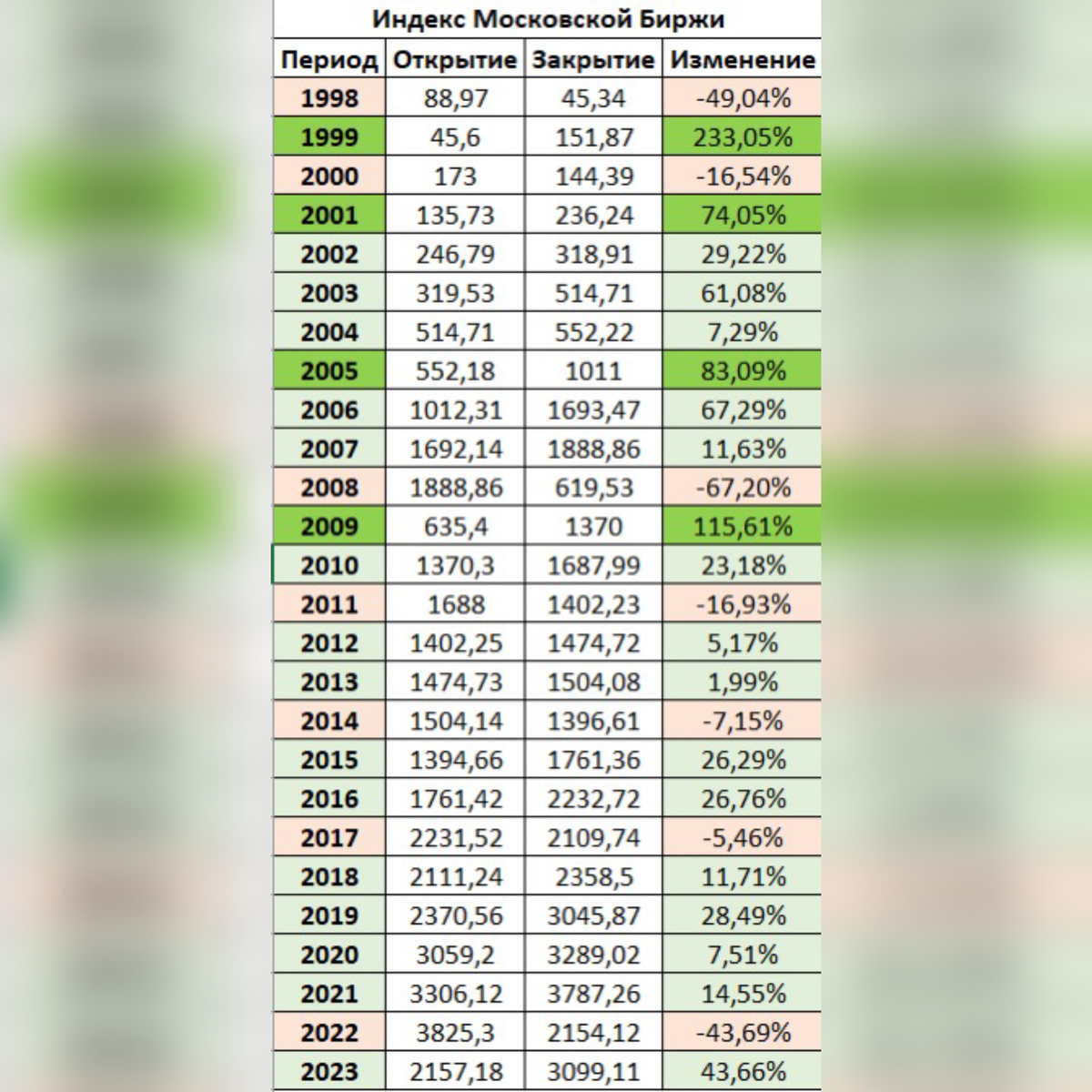 Привет, друзья мои! На скрине вы видите динамику индекса Московской Биржи за 26 лет (инфа из моего видео, которое недавно публиковала на ютуб). Я хочу акцентировать ваше внимание на нескольких важных выводах, которые можно сделать из этой статистики. ✅1. За 26 лет было 7 убыточных периодов и 19 прибыльных, т.е. основную часть времени рынок акций всё-таки растёт ✅2. Ни разу не было такого, чтобы два года подряд были падающие годы! Ни разу! После падающего года всегда следовал год роста. Т.е. главный вывод заключается в том, что если рынок акций за год упал, то это лучший момент для того, чтобы покупать, потому что следующий период имеет очень высокую вероятность вырасти. ✅3. Супер растущие годы были именно после периодов спада, так получалось во многом потому, что срабатывал эффект низкой базы. ✅4. Застойный период был с 2011 по 2014 г. – за этот срок цены на акции в целом не росли, а скорее сползали вниз. ✅5. В 2022 г. рынок упал меньше, чем в 2008 г.! Но и восстановление после 2022 г.