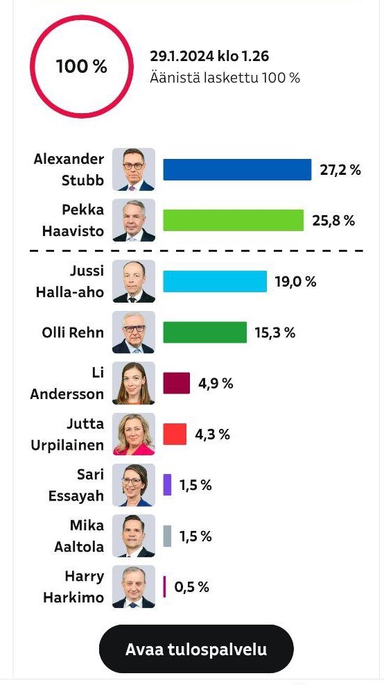 На президентских выборах в Финляндии в первом туре (28.01) победитель не определился. Первые двое кандидатов, набравшие наибольшее число голосов, попали во второй тур, состоится который 11 февраля. Выбирать избиратели будут между А. Стуббом и П. Хаависто. Разница по голосам у них после первого тура незначительная: за Стубба проголосовало 27,2% финнов, за Хаависто - 25,8%. Фактически электорат разделился поровну. Во втором туре многое будет зависеть в какую сторону качнутся избиратели голосовавшие за расиста из партии «Истинные финны» Юсси Халла-Ахо, набравшего по итогам первого тура голосования высокий процент поддержки в 19 пунктов. Спикер парламента Финляндии Халла-Ахо отличается зашкаливающей русофобией, требованием выселять из страны мигрантов и критическим отношением к Евросоюзу.