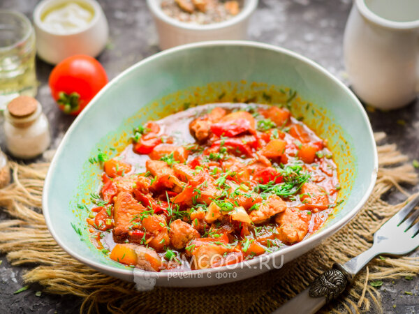3. Выложите все нарезанные компоненты на сковороду с маслом и пожарьте до готовности, периодически перемешивая (около 5-7 минут). Затем добавьте соус, измельчённый чеснок, соль, перец по вкусу. Готовьте курицу с овощами под крышкой примерно 15 минут.