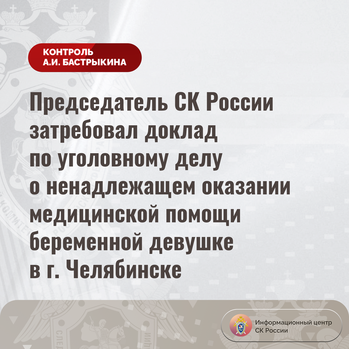Председатель СК России затребовал доклад по уголовному делу о ненадлежащем оказании медицинской помощи беременной девушке в г. Челябинске