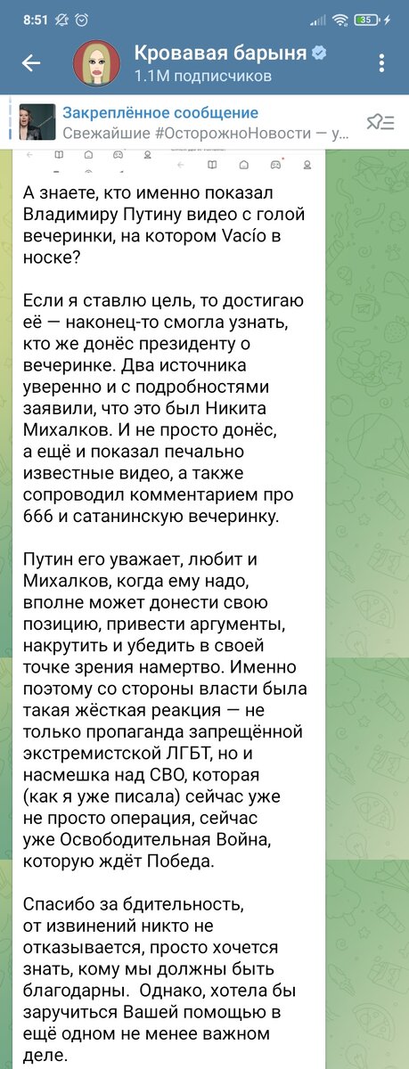 Ксения Собчак обвинила режиссёра Никиту Михалкова в "сдаче" всех участников "голой" вечеринки у Анастасии Ивлеевой президенту страны. Сделала она это через телеграм-канал "Кровавая барыня", принадлежащий именно ей. Приводим из него пост: Ответ Михалкова Ксении Собчак по вечеринке Никита Сергеевич не стал тянуть с ответом: «Есть две категории людей: есть люди, которые точно ничего не знают, а есть люди, которые знают все, но не точно. Я предпочитаю первых — по крайней мере, они при желании хоть что-нибудь точно могут узнать. В те нечастые возможности встречи и разговора с президентом, уверяю вас, у нас есть более интересные и важные темы для обсуждения, нежели привлечь интерес президента к этому геронтологическому празднику жизни, состоявшемуся 20 декабря в клубе „Мутабор“, в котором вы тоже имели бесстрашие участвовать», — пишет Михалков. Также режиссер отреагировал на просьбу Собчак обратить внимание на статью издания «Экспресс-газета» о похоронах поэта Льва Рубинштейна, которую журна