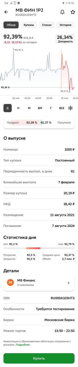 Как вам нравятся такие цифры? Не вдаваясь в аналитику, что такое МВ Финанс и с чем его едят. Предположим они не банкроты и погасят свои облигации 7 августа 2024 года. Итак, нас ждут 3 купона по 20,19 руб и при погашении ещё 76.01 руб. Итого 136.58 до выплаты налога или 118,82 чистыми. При потраченных нами 923,9+18,42(нкд) +0,7 (комиссия) =943,02 на одну облигацию. Вроде как всё посчитал. До 7 августа осталось 7 месяцнв и 8 дней. В январе я открыл вклад на 6 месяцев под 15,5% годовых, с капитализацией получится 16% до 14.07.24. Без пополнений и снятия. Не огромный процент, но думаю, я не один кто завёл короткий депозит примерно на таких же условиях. При вложенных 300 000 руб 15.07. вкад закроется и на нём будет 323 730 рублей. Т е плюс 23 730 руб. Гарантированных на сто процентов. На 300 000 мы смогли бы купить вчера в 16.16 местного времени 318,126 облигаций, если бы столько набралось в стакане 😂. И через 7 месяцев и 8 дней получили бы 318,126 *118,82= 37 799 руб прибыли. Не гарант