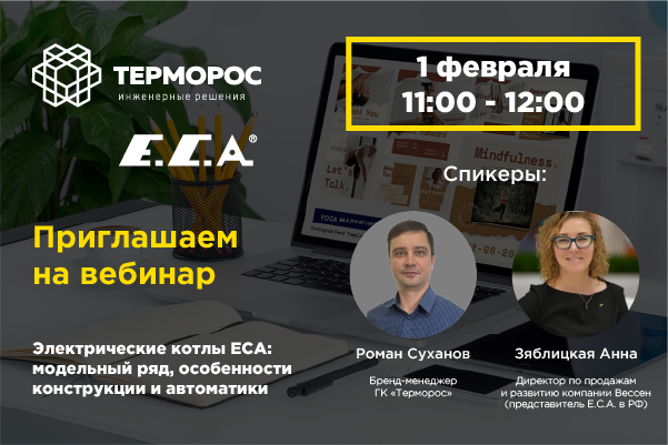 Приглашаем на вебинар, посвященный электрическим котлам E.C.A.: их модельному ряду, особенностям конструкции и автоматики. На вебинаре будет рассмотрен модельный ряд электрических котлов E.C.A., производимых в Турции. Котлы появились на российском рынке около 2-х лет назад и за это время успели приобрести популярность благодаря своим конструктивным решениям и функциональным возможностям. Слушатели вебинара узнают все о предлагаемых одноконтурных и двухконтурных электрических котлах E.C.A., их мощностном ряде, комплектации и возможностях встроенной автоматики. Дата вебинара: 01 февраля 2024 года с 11:00 до 12:00. Спикеры: • Роман Суханов, бренд-менеджер ГК «Терморос». • Анна Зяблицкая, директор по продажам и развитию компании «Вессен» (представитель Е.С.А. в РФ). Участие в вебинаре бесплатное. Необходима регистрация по ссылке.