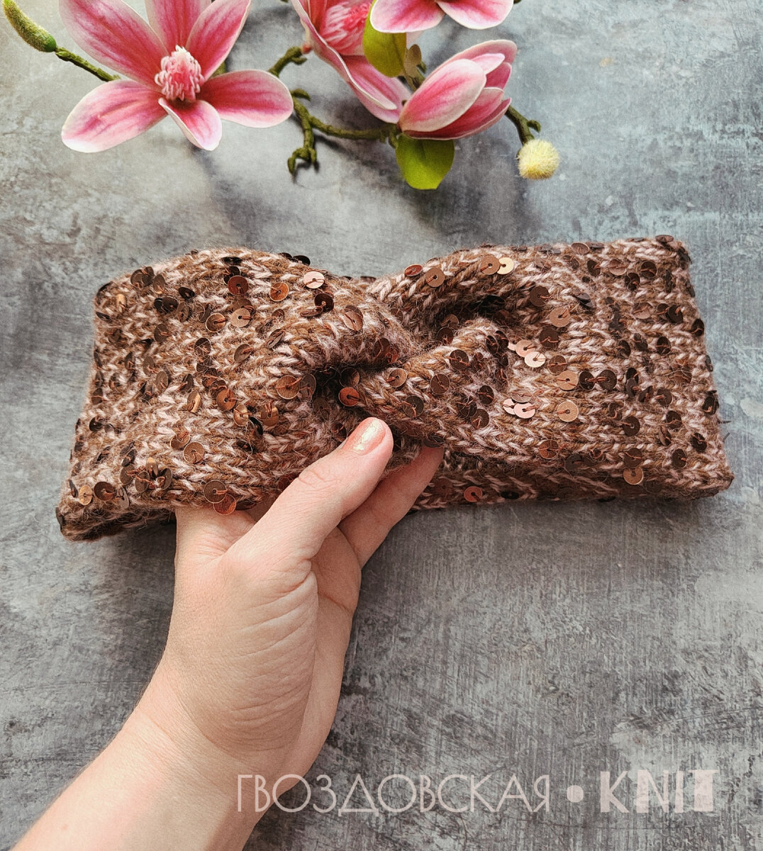 Вяжем повязку из остатков пряжи и самовязаной нити с пайетками