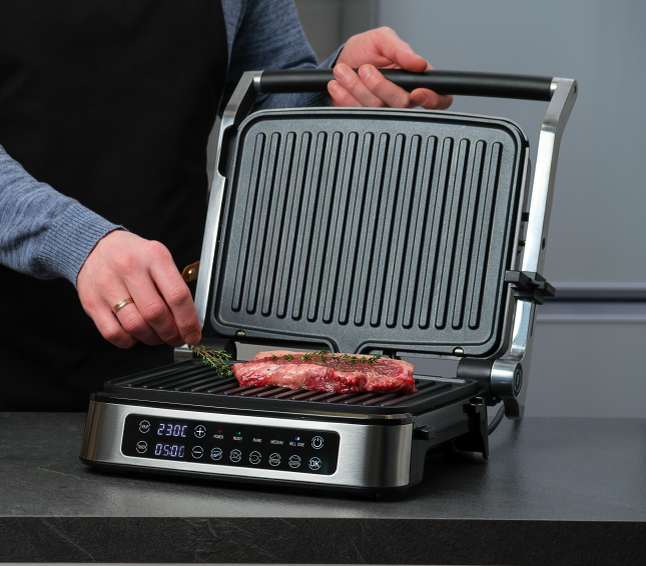 Здоровое питание - залог активного и качественного образа жизни. Stonberg знает, как важно сохранять полезные качества продуктов и предлагает обратить внимание электрический гриль для дома со съемными панелями. Мясо на электрогриле - одно из самых вкусных и популярных блюд среди пользователей. Добиться превосходного вкуса, румяной корочки и сочности текстуры в домашних условиях возможно каждому, выполняя всего несколько условий. Поздравляем, теперь вы настоящий шеф! Обратите внимание, что электрогриль требует правильного ухода. Не забывайте вынимать резервуар для лишней жидкости и промывать его. Удаляйте загрязнения с поверхности панелей пока гриль еще теплый. Почему электрогриль Stonberg - незаменимый помощник на кухне? Многофункциональный электрогриль Stonberg позволяет готовить любимые блюда дома без добавления масла. Благодаря антипригарному покрытию съемных панелей и высокой мощности нагревания до 230 градусов, курица, мясо или рыба не прилипают к прибору и достигают полной прож