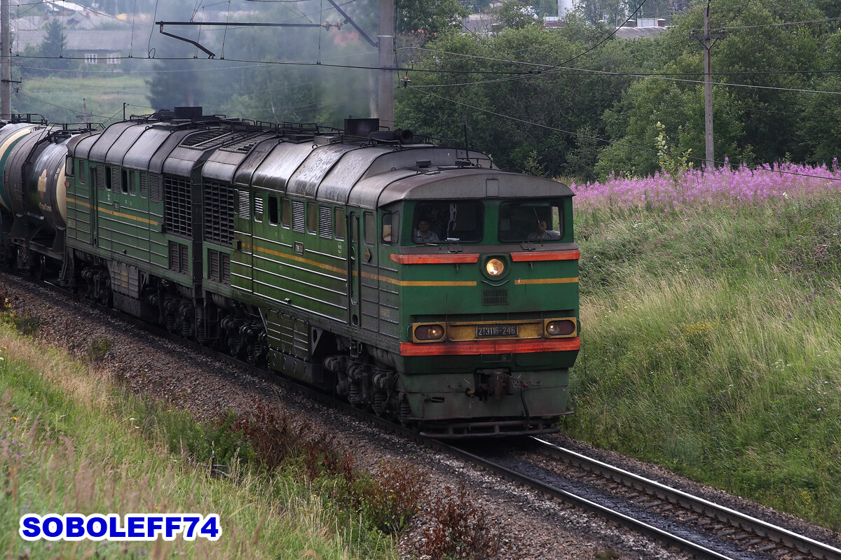 Тепловоз 2ТЭ116-246 с грузовым поездом. Перегон Волоколамск - Благовещенское Московской железной дороги. Июль 2006 года. Да, когда-то "фантомасы" были зелёными, кто бы мог подумать. Сейчас 2ТЭ116 в Волоколамске - редкость, зелёных не осталось совсем, а именно этот тепловоз давно списан.