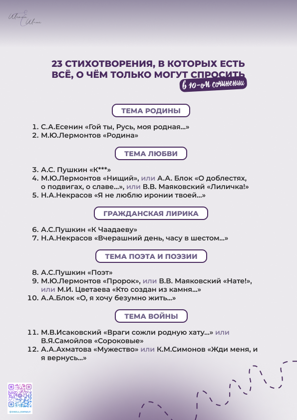 В 10-ом задании есть вопросы от самых широких тем («В каких ещё стихотворениях звучит тема любви..?») до самых изощрённых («В каких ещё стихотворениях встречался образ дерева..?»). Я учла всё, что только могут спросить на экзамене, и создала список из 23 стихотворений, которые нужно выучить к экзамену, чтобы справиться с любым вопросом!