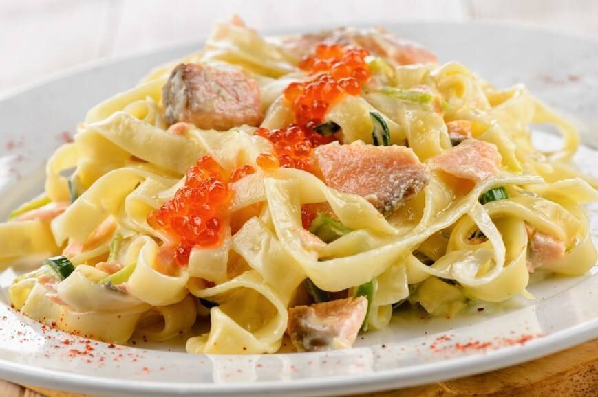 После вертолетного заброса на маршрут, гости заповедного края, пробуют множество деликатесов. Причем не только сибирских как сугудай, малосол. Предлагаем узнать о том, как приготовить на природе, известное итальянское блюдо, достойное ресторанов или кафе, «Фетучини» с благородным лососевым представителем. Особое макаронное изделие при варке отвердевает. Тонко нарезанная лапша, которую опытная домохозяйка способна сделать своими руками, придавая блюду с красной рыбой уникальный вид. А при сочетании с красной икрой, делает блюдо настоящим деликатесом.