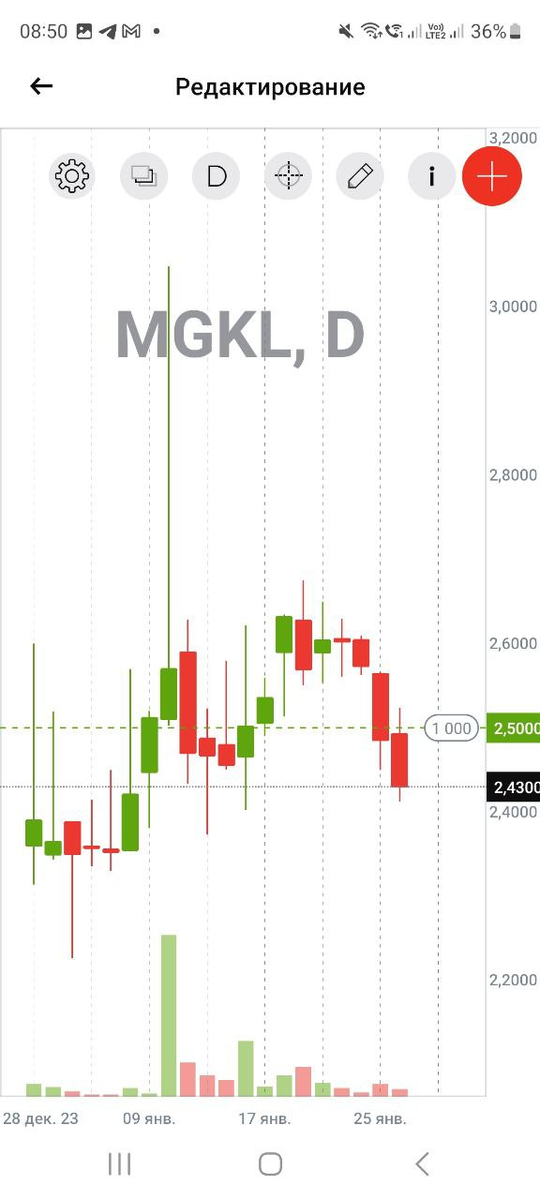 Мне они изначально не нравились, поэтому заявка у меня была небольшая, а после сдвигов срок, я её ещё сильнее уменьшил и теперь владею 1000 акциями #MGKL, купленными по 2,5 руб/шт. За месяц акции нашли свой минимум на отметке 2,22 руб (-10%), а максимум был 3,04 (+22%), но недолго (один день), хотя ровно половину месяца они всё-таки торговались выше стартовой цены, и желающие могли продать их в плюс.