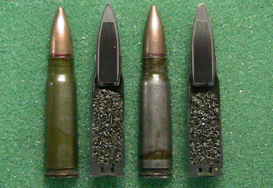 Начнем с пуль в сплошной биметаллической оболочке. За счет отказа от стального сердечника у пуль немного увеличилась масса - с 7,9 гр до 8 ровно. Упростилось производство - для штамповки таких пуль нужен был только свинец и биметаллическая фольга.