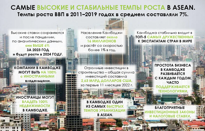 Почему стоит рассмотреть инвестиции в недвижимость в Камбодже? Во-первых, Камбоджа впечатляет своим экономическим прогрессом, что делает ее привлекательной для потенциальных инвесторов. Согласно отчету Всемирного банка, в 2021 году ВВП страны вырос на 7,1%, в то время как многие страны в мире столкнулись с экономическими трудностями. Это подтверждает высокую стабильность и жизнеспособность экономики Камбоджи. Кроме того, Камбоджа является стратегическим инвестиционным центром в регионе Юго-Восточной Азии. Благодаря своему расположению в рамках Ассоциации государств Юго-Восточной Азии (ASEAN), Камбоджа предлагает доступ к огромному рынку потребителей, состоящему из более чем 650 миллионов человек. Это создает благоприятные возможности для различных отраслей, включая недвижимость. Интересно отметить, что Камбоджа также известна своим молодым и динамичным населением. Средний возраст жителей страны составляет около 25 лет, что означает растущий спрос на жилые, коммерческие и торговые площа