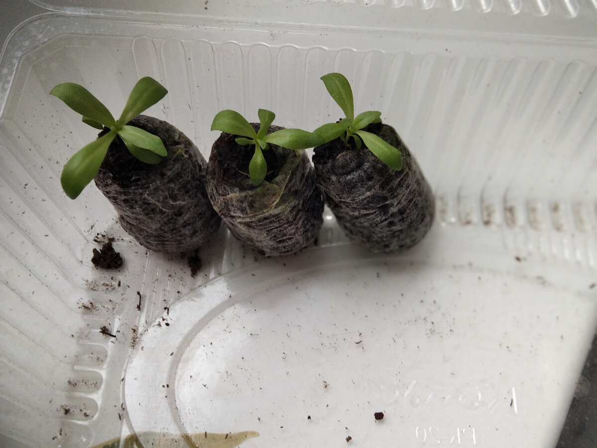 Пять семечек сорта, 'Блу чип' были посеяны в торфяные таблетки в конце ноября и оставлены у дочери с зятем под фитолампой (у меня лампы нет). Взошло три штуки. Зять за ними ухаживал исправно, фотографии присылал, и сегодня я решила, что пора их пересаживать в горшочки. Вот такими они были до пересадки.
