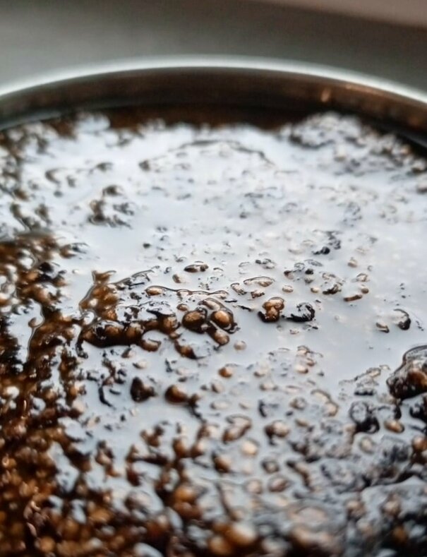 Утром, ну или спустя указанное время, нам нужно взять листья нори и измельчить их в блендере, или кофемолке. Добавляем нори и масло в семена чиа и хорошенько перемешиваем. Получившуюся черную икру нужно оставить еще на пару часов, но уже в холодильнике. Конечно можно и сразу намазать ее на хлеб, но постояв, она приобретет более насыщенный вкус.