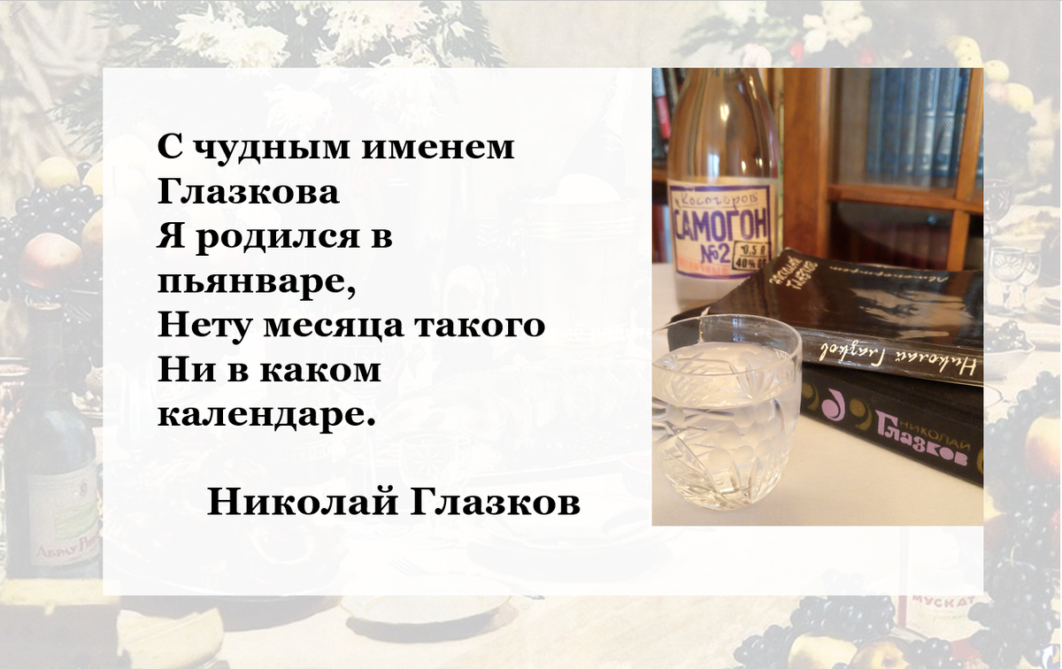 Замечательный русский поэт, футурист, небывалист, гражданин Поэтограда, актёр и водкофил Николай Глазков родился 30 пьянваря 1919 года в Нижегородской губернии. Глазков – мой любимый поэт, его стихи сопровождают меня большую часть сознательной жизни. Разумеется, я не могу не отметить день его рождения. Почитатели творчества поэта, присоединяйтесь! Неофиты тоже. Если вы любите поэзию, вам понравится. Впервые с творчеством Николая Глазкова я познакомился в 1985 году, практически случайно. Вспоминаю счастливое и беззаботное лето, которое я провел в стройотряде в Томской области на одной из социалистических строек. После работы оставалось немножко свободного времени, заполнить которое употреблением портвейна не было ни единого шанса – Егор Кузьмич Лигачев сделал из области витрину борьбы с пьянством. (Поступили по-чиновьичьи просто – жестко ограничили торговлю спиртным. В полумиллионном городе оставили только два торгующих водкой магазина. Строго – одна бутылка в руки). Решение проблемы за