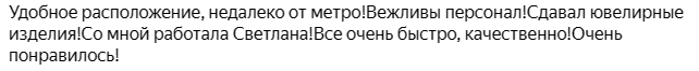 - удобство: можно оценить украшения удаленно, возможен выезд оценщика на дом, наличный и безналичный расчет, офис расположен в двух минутах ходьбы от станции метро;