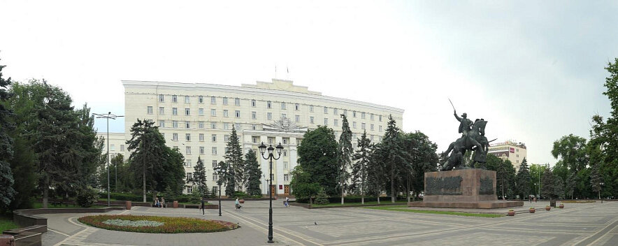 В 1930 году состоялся конкурс на лучший проект Дома Советов – места сосредоточения административных и партийных органов власти Северо-Кавказского края. Проект, принятый за основу, предусматривал строительство гигантского комплекса зданий, который должен был занять все пространство между нынешними улицами Станиславского и Большой Садовой, проспектами Ворошиловским и Соколова. Вот так будущий Дом Советов должен был выглядеть, если смотреть на него с пересечения Большой Садовой и Ворошиловского.