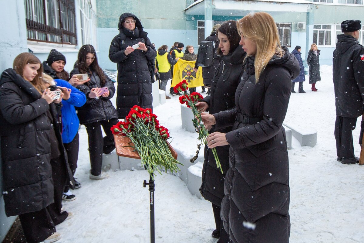 Марина Андрейчук и Елена Губина возложили цветы к школьному мемориалу в честь погибшего участника СВО. Мемориальная доска Герою России Александру Крынину появилась на фасаде СОШ № 95, которая уже носит его имя. Выпускник этого учебного заведения, старший лейтенант Александр Крынин во время штурма украинскими войсками села Малая Рогань Харьковской области уничтожил десяток врагов и подбил бронемашину пехоты. Благодаря действиям офицера наступление противника было отбито. Но спустя три дня, выходя из окружения, Александр получил осколочные ранения, не совместимые с жизнью. Указом президента Владимира Путина он посмертно был удостоен звания «Герой России». Участники митинга памяти почтили погибшего минутой молчания. Затем состоялась церемония возложения цветов к мемориальной табличке, установленной на центральном фасаде школы.