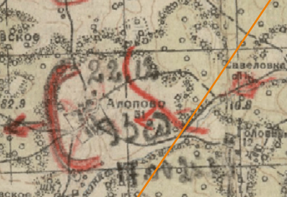 Доброго всем дня! Как-то, просматривая боевые донесения 93-й стрелковой дивизии, наткнулся на сводку за 27.12.1941 года начальника штаба дивизии Коренкова. В сводке описывались наступательные действия 1129-го стрелкового полка в лесу на границе Жуковского и Боровского районов Калужской области. ".... По данным передовых отрядов установлено наличие в лесу западнее Алопово, в районе отметки 182,9, противника силами до двух рот. Установлено два капонира с танками на дороге из Алопово и Аристово..." Это короткое сообщение вызвало большой интерес, так как я частенько хожу на утиную охоту, на болото примерно в 2-х километрах от указанного леса. Просмотрев карту РККА 1940 года, нашел указанную в сводке высоту. После привязав карту к современному снимку, ориентировочно локализовал место осмотра. К тому же, на снимке отчетливо просматривались две лесных дороги, которые сходились в месте предполагаемой высотки. Выбрав время, пошел на поиски.... В принципе обнаружить высотку не составило особог