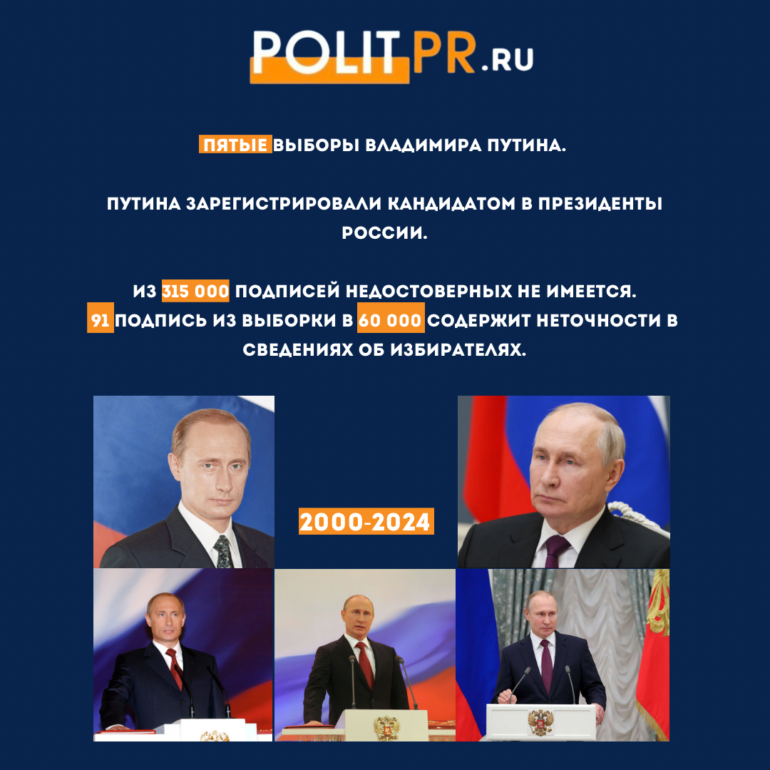 Максимально возможное количество подписей в поддержку своего выдвижения – 315 000 тысяч - штаб Путина сдал 22 января. За неделю все проверили. Отобрав случайным образом 60 тысяч подписей, 91 подпись содержала неточности в сведениях избирателей.